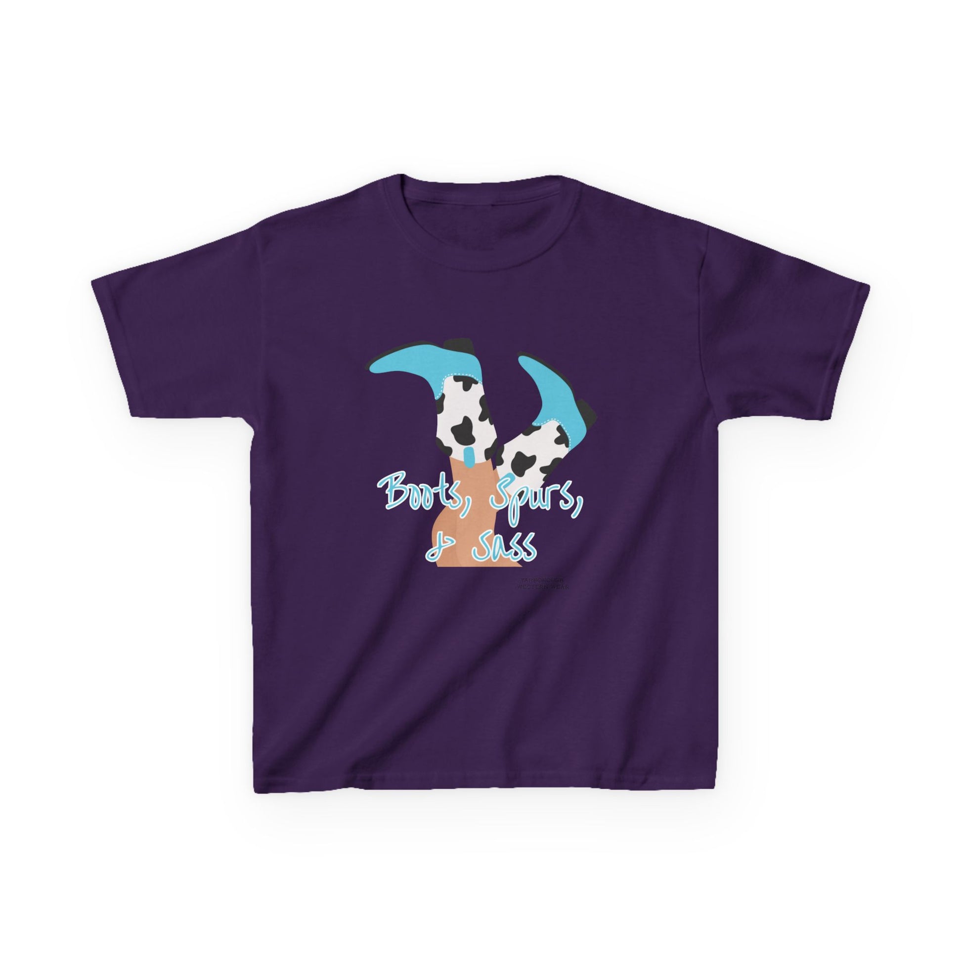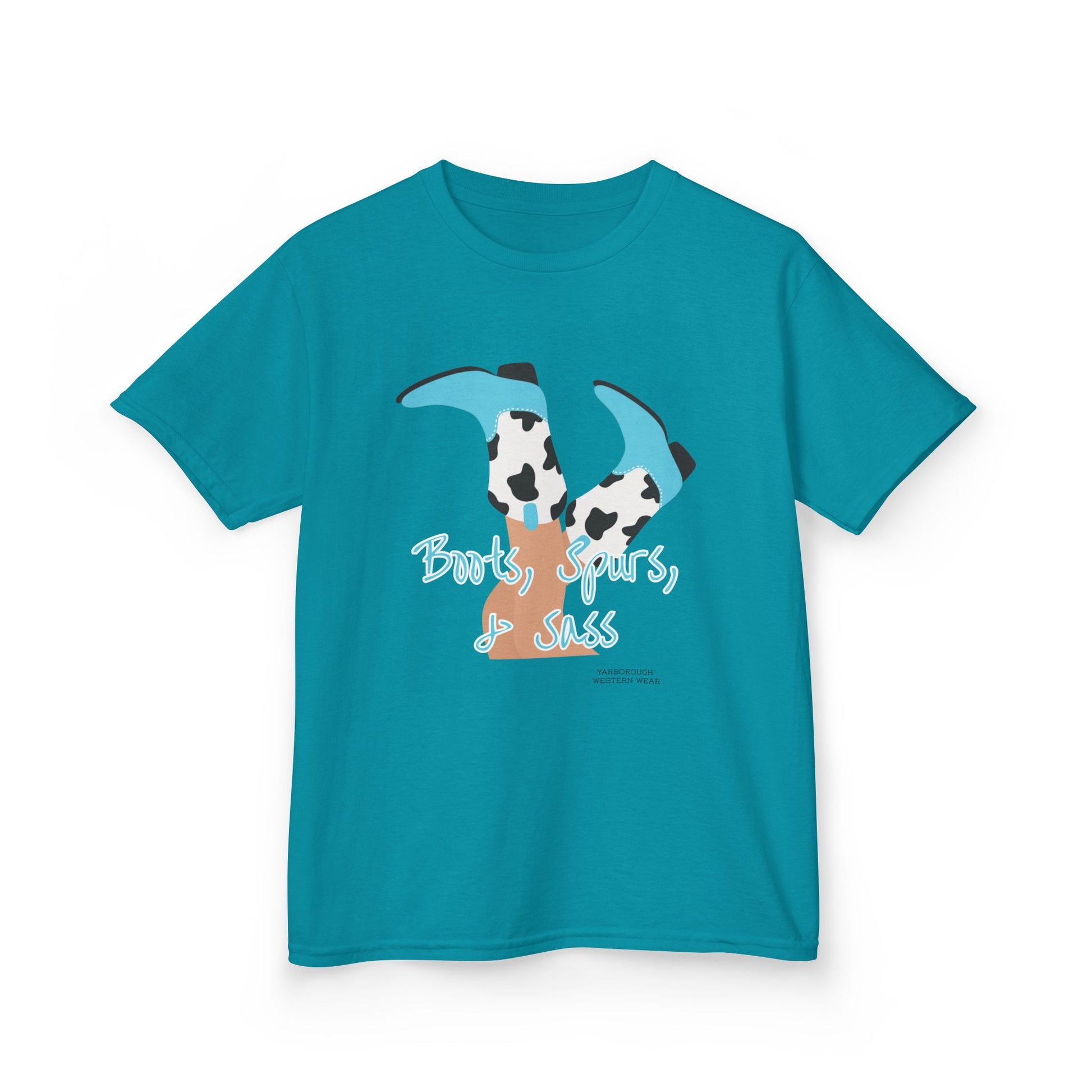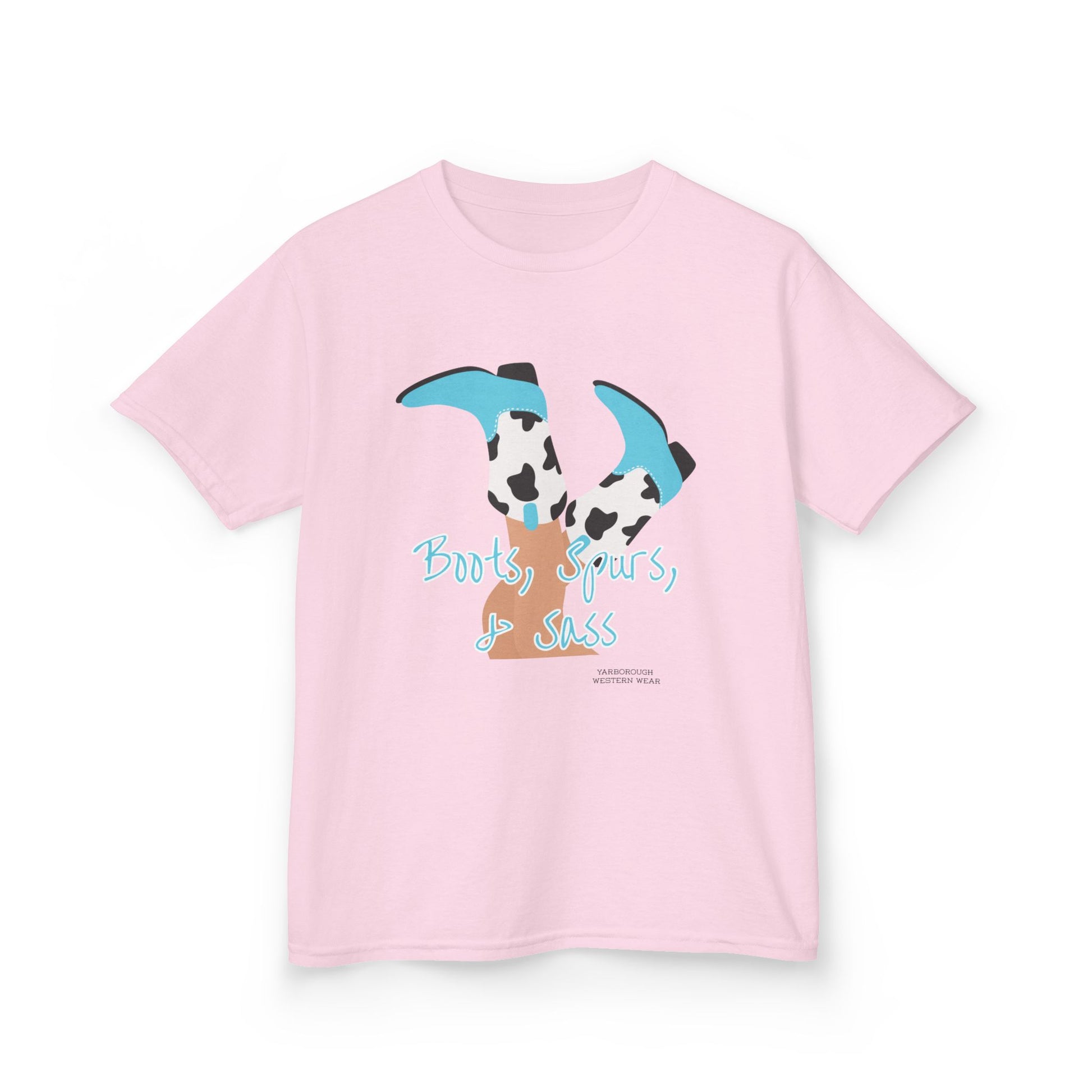 This Kids Tee featuring boots, spurs, and sass is perfect for cowgirl, rodeo, and western girls. The design exudes a fun and adventurous vibe, making it a great addition to any kid's wardrobe. Ideal for little ones who love all things western and are looking to showcase their inner cowgirl spirit. Perfect for rodeo events, country western parties, and everyday wear.