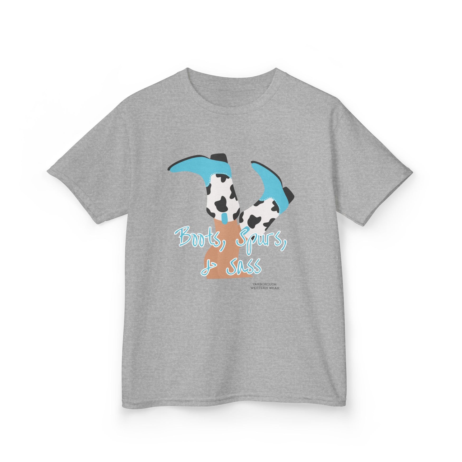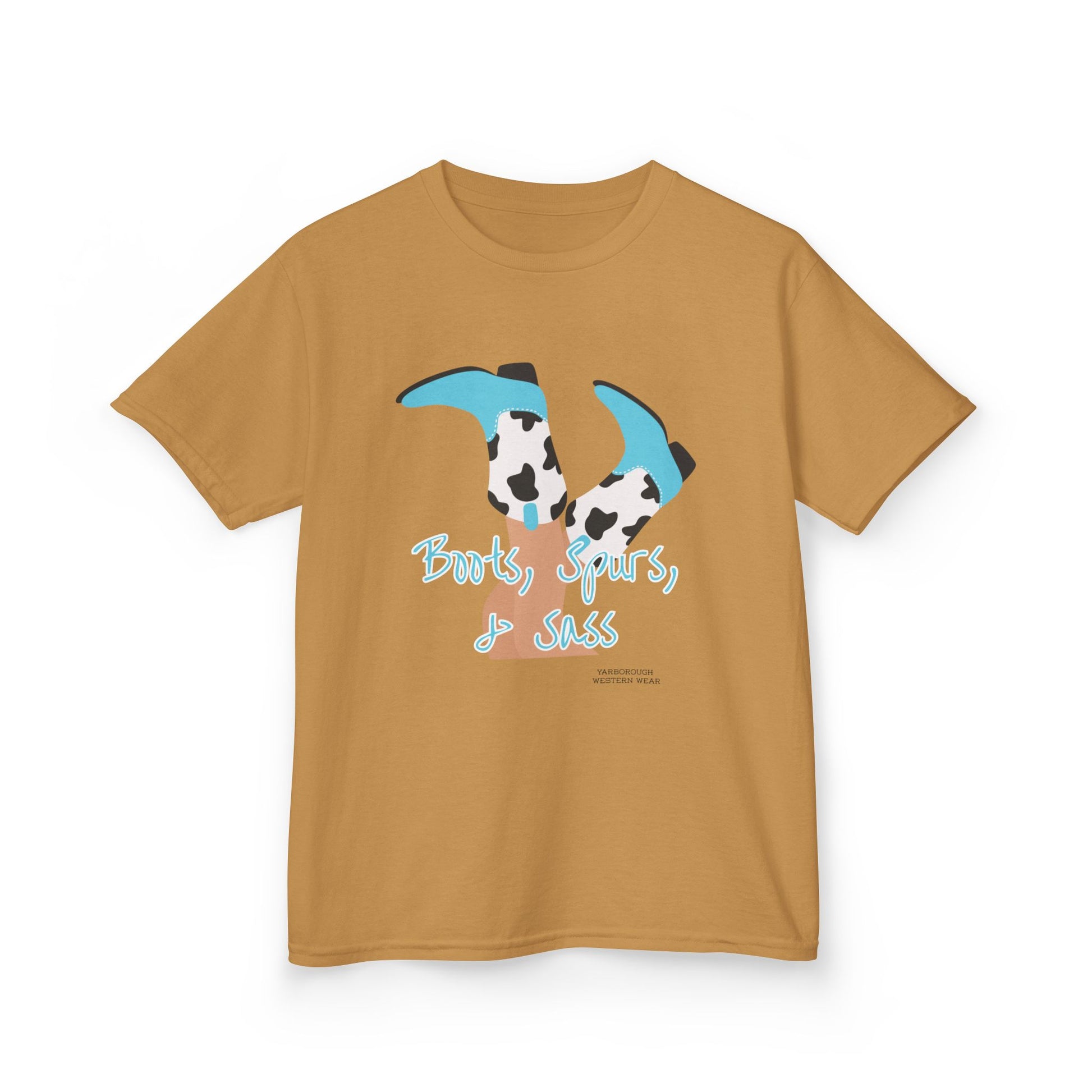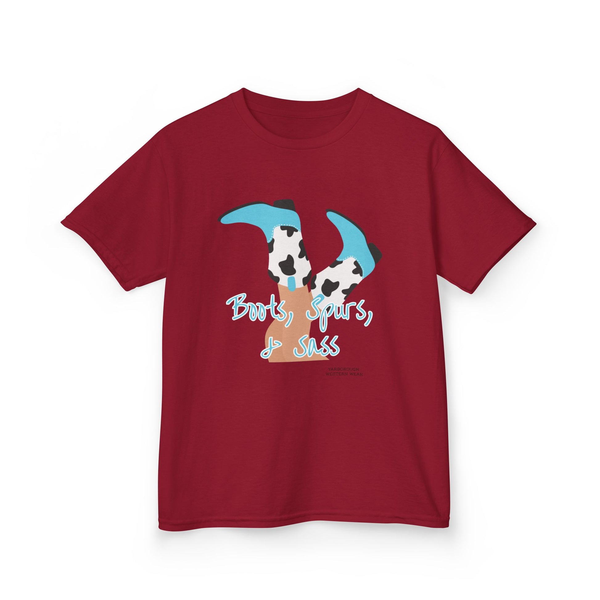 This Kids Tee featuring boots, spurs, and sass is perfect for cowgirl, rodeo, and western girls. The design exudes a fun and adventurous vibe, making it a great addition to any kid's wardrobe. Ideal for little ones who love all things western and are looking to showcase their inner cowgirl spirit. Perfect for rodeo events, country western parties, and everyday wear.